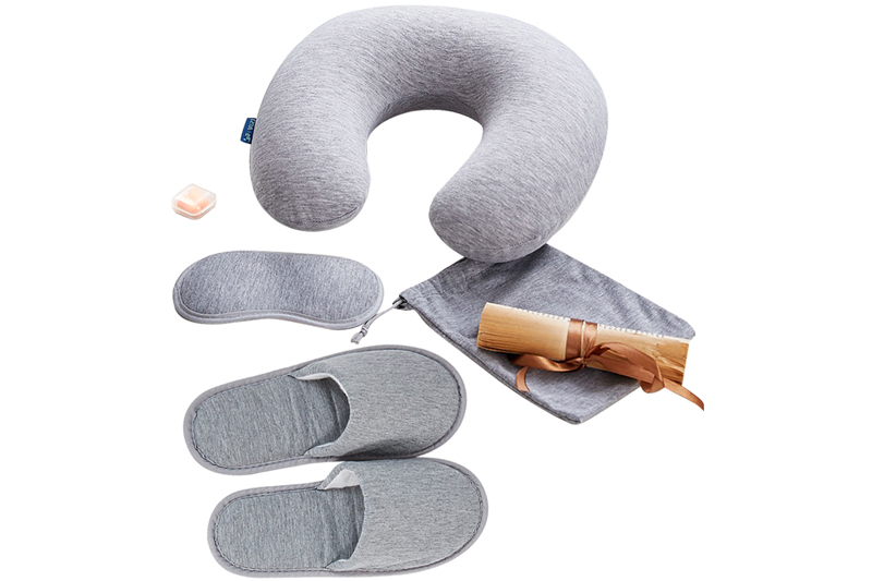材質:U枕-針織布(聚酯纖維) 內(nèi)芯-加厚PVC 拖鞋/眼罩/收納袋-針織布(聚酯纖維)